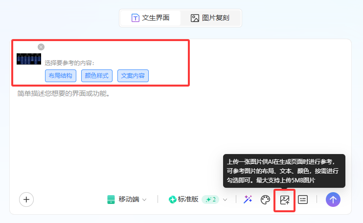 - 上传图片: 点击“图生界面”区域,上传你的手绘草图、截图或 参考图。