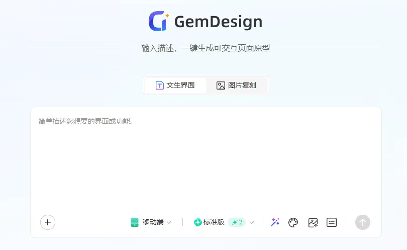 - 找到“文生界面”入口: 在 GemDesign 新建应用并进入后,你会看到一个醒目的输入框